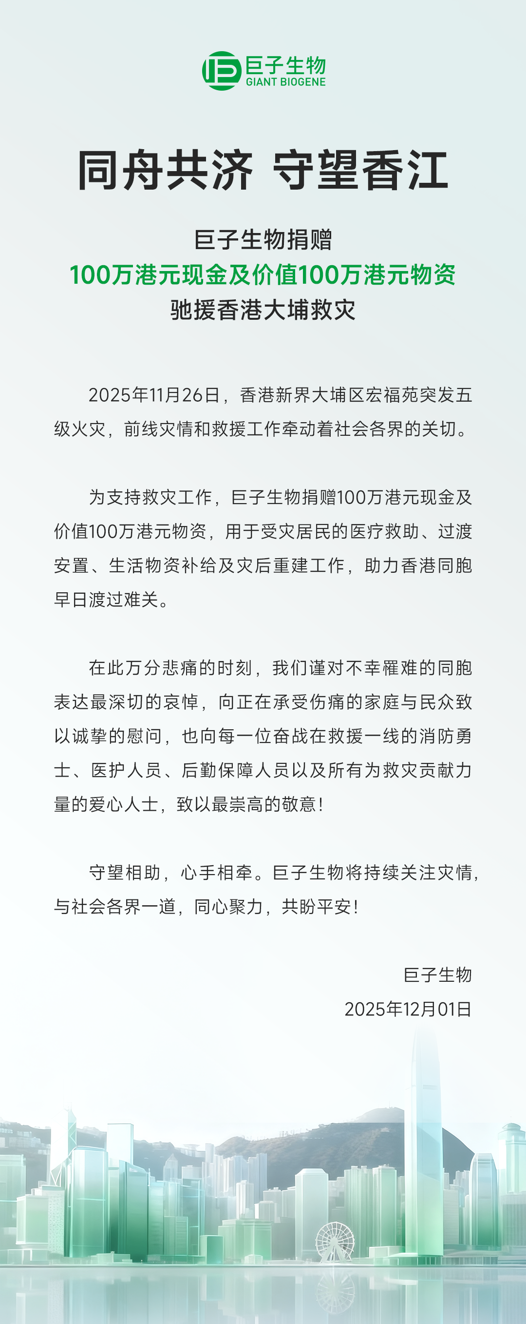同舟共济,守望香江 | 巨子生物捐赠100万港元现金及价值100万港元物资,驰援香港大埔救灾